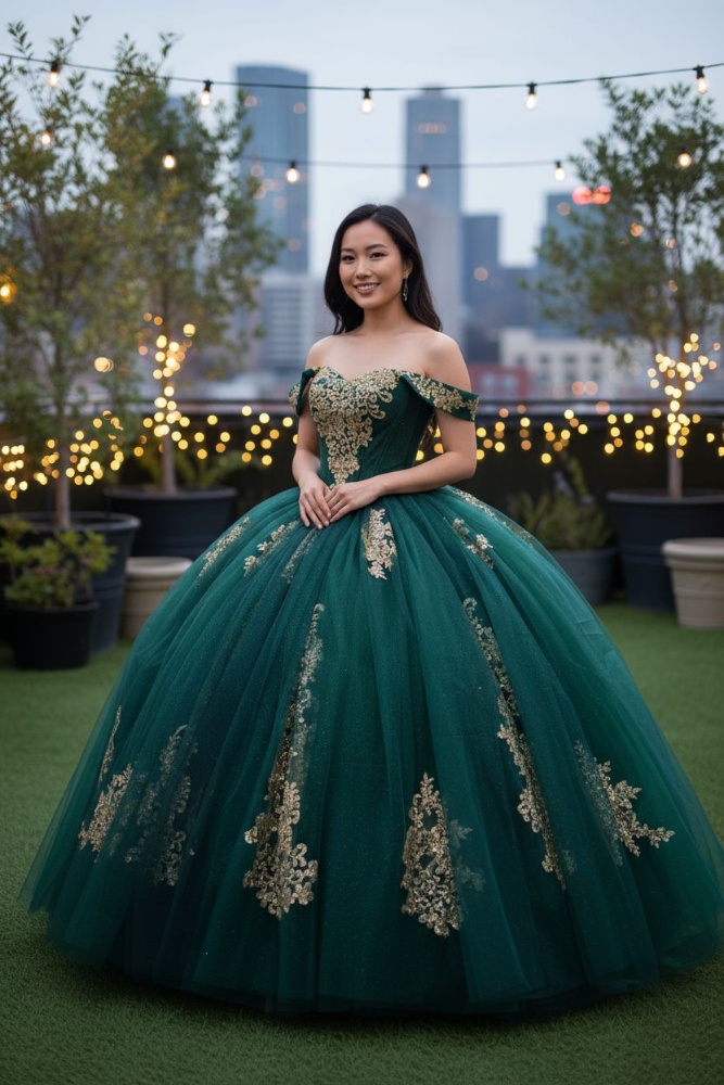 Confeccionado totalmente a la medida, con falda amplia y detalles de alta costura que realzan la elegancia y el estilo princesa.